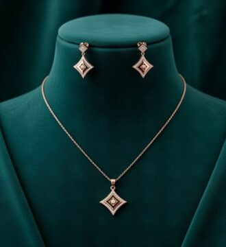 Enhance your elegance with this beautifully designed rose gold polish pendant chain and matching earrings set. Featuring a graceful square-shaped pendant with intricate detailing and a sparkling border, this set reflects a perfect blend of modern style and timeless charm.