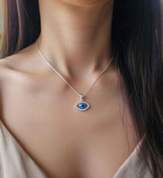 ₹746.55 Original price was: ₹746.55.₹641Current price is: ₹641.This graceful evil eye pendant features a striking blue eye design accented with delicate detailing, symbolizing protection and positive energy. Its minimal and elegant style makes it perfect for everyday wear and meaningful gifting.