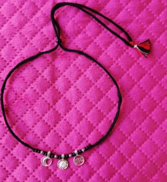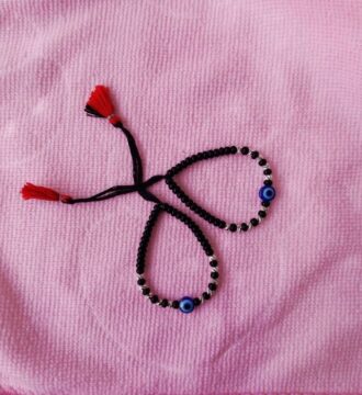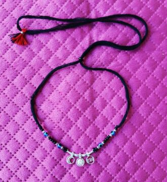 ₹1,651.65 Original price was: ₹1,651.65.₹1,430Current price is: ₹1,430.This traditional kids nazariya necklace is designed to be worn around a child’s neck for protection against negative energy and evil eye. Crafted with black beads and symbolic charms, it is believed to safeguard children from buri nazar while being lightweight and comfortable for daily wear.