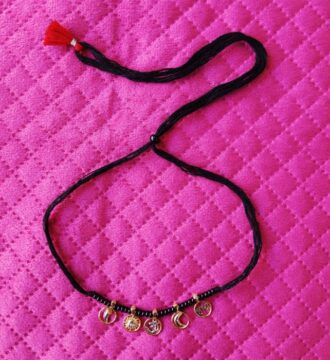 ₹2,483.25 Original price was: ₹2,483.25.₹2,150Current price is: ₹2,150.This traditional kidsgold plated nazariya necklace is designed to be worn around a child’s neck for protection against negative energy and evil eye. Crafted with black beads and symbolic charms, it is believed to safeguard children from buri nazar while being lightweight and comfortable for daily wear.