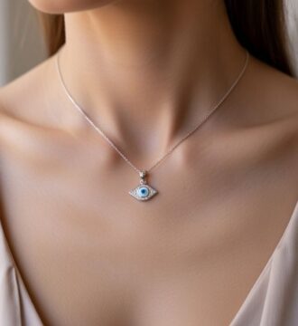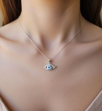 ₹845.25 Original price was: ₹845.25.₹797Current price is: ₹797.This graceful evil eye pendant features a striking blue eye design accented with delicate detailing, symbolizing protection and positive energy. Its minimal and elegant style makes it perfect for everyday wear and meaningful gifting.