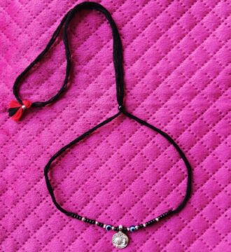 ₹2,379.30 Original price was: ₹2,379.30.₹2,060Current price is: ₹2,060.This traditional kids nazariya necklace is designed to be worn around a child’s neck for protection against negative energy and evil eye. Crafted with black beads and symbolic charms, it is believed to safeguard children from buri nazar while being lightweight and comfortable for daily wear.