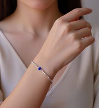 ₹2,065.35 Original price was: ₹2,065.35.₹1,772Current price is: ₹1,772.This elegant silver chain bracelet features a charming blue evil eye centerpiece, symbolizing protection and positive energy. Minimal, lightweight, and stylish, it is perfect for everyday wear, layering, or meaningful gifting.