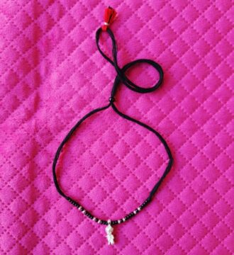 ₹1,651.65 Original price was: ₹1,651.65.₹1,430Current price is: ₹1,430.This traditional kids nazariya necklace is designed to be worn around a child’s neck for protection against negative energy and evil eye. Crafted with black beads and symbolic charms, it is believed to safeguard children from buri nazar while being lightweight and comfortable for daily wear.