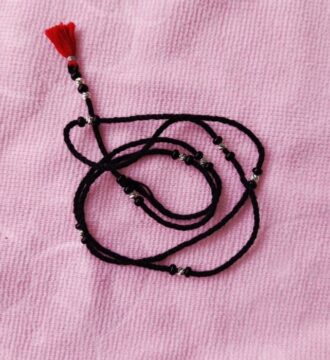 ₹628.95 Original price was: ₹628.95.₹540Current price is: ₹540.This elegant Child Tagdi is crafted with soft black thread and finely polished silver beads, designed especially for children.