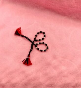 ₹913.50 Original price was: ₹913.50.₹780Current price is: ₹780.This beautiful Laddu Gopal Nazariya Bracelet is designed with black beads and silver beads, finished with soft red thread tassels.It is traditionally worn to protect from negative energy and bring positivity, peace, and divine blessings.Perfect for adorning Laddu Gopal Ji, this nazariya reflects devotion, purity, and care in a simple yet auspicious design.