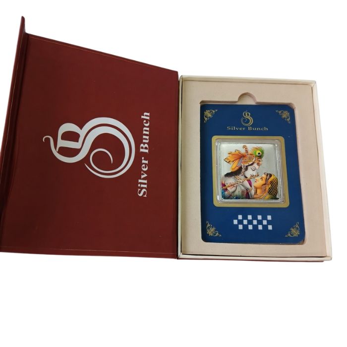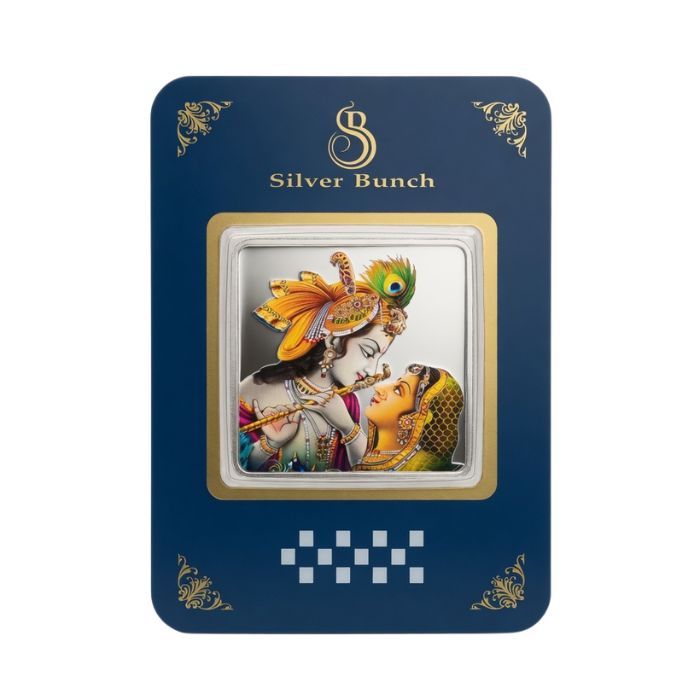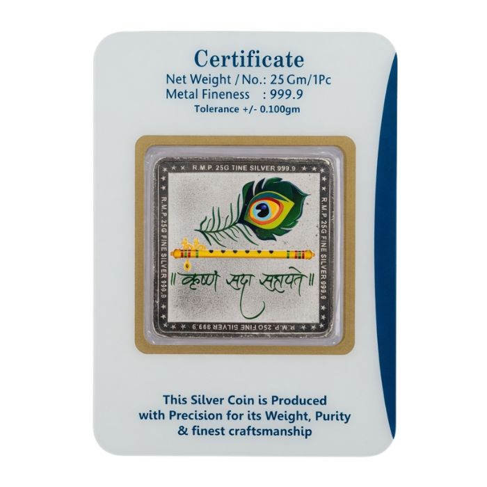 The SRK Jewelry 25 Gram 999 Pure Silver Coin features a beautifully crafted Radha Krishna color printed design, symbolizing eternal love, devotion, and divine blessings. Packed in a premium card packaging, it is perfect for gifting and spiritual occasions.