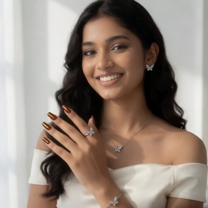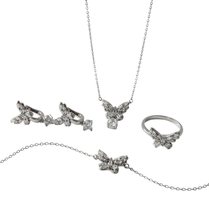 Elegant 925 Sterling Silver Jewellery Set with butterfly design, including necklace, earrings, ring, and bracelet. Lightweight, stylish, and perfect for daily wear or gifting.