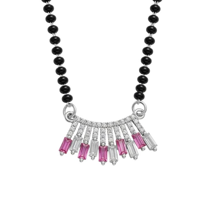 Elegant 925 Sterling Silver Mangalsutra with pink and white CZ fringe drop design. Lightweight, stylish, and perfect for daily wear or gifting.