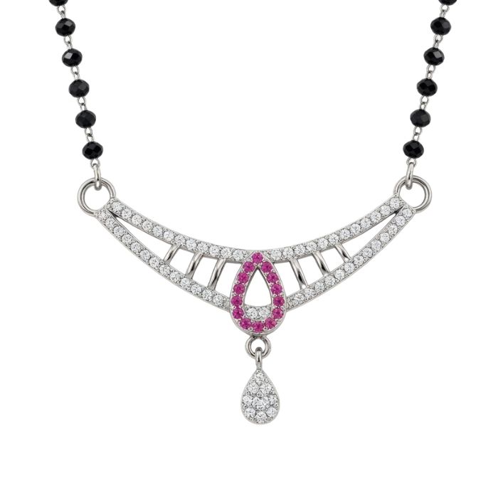 Elegant 925 Sterling Silver Mangalsutra with pink teardrop CZ pendant and sparkling stones. Lightweight, stylish, and perfect for daily wear or gifting.
