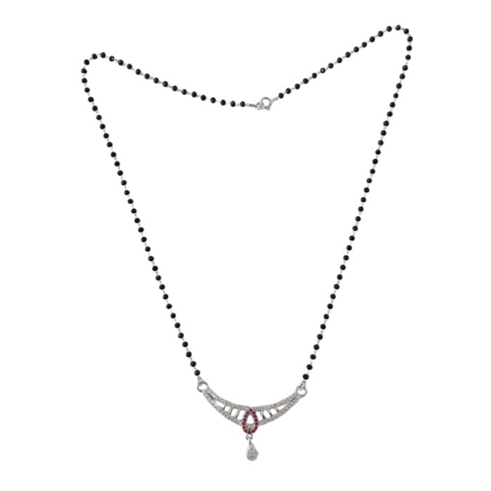 Enhance your jewellery collection with this stunning 925 Sterling Silver Mangalsutra from SRK Jewelry. Designed with a graceful pink teardrop motif at the center, surrounded by shimmering cubic zirconia (CZ) stones, this piece exudes elegance and charm.