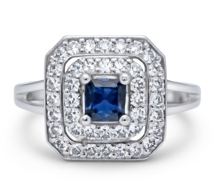 This elegant silver ring features a striking square-cut blue center stone surrounded by sparkling diamond accents. Designed with a sleek and polished finish, it offers a perfect blend of modern sophistication and timeless charm. Ideal for special occasions or everyday elegance, this ring adds a refined touch of color and brilliance to any look.