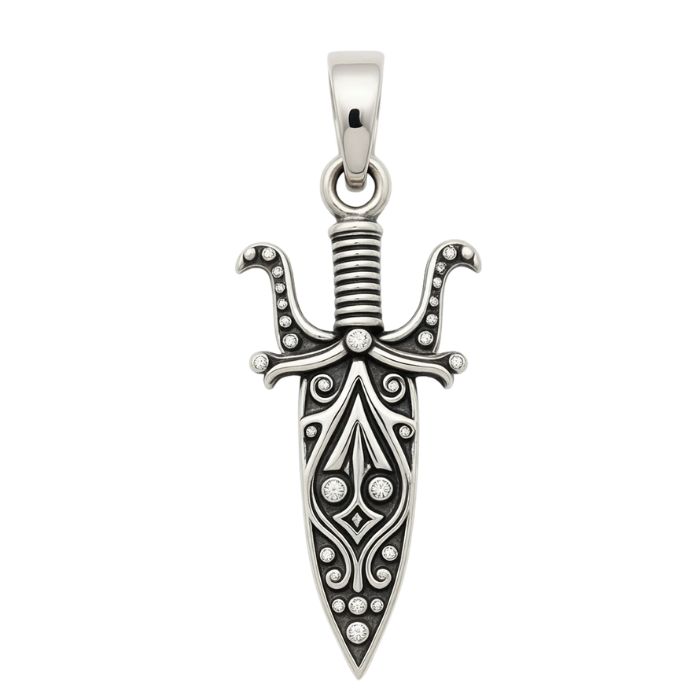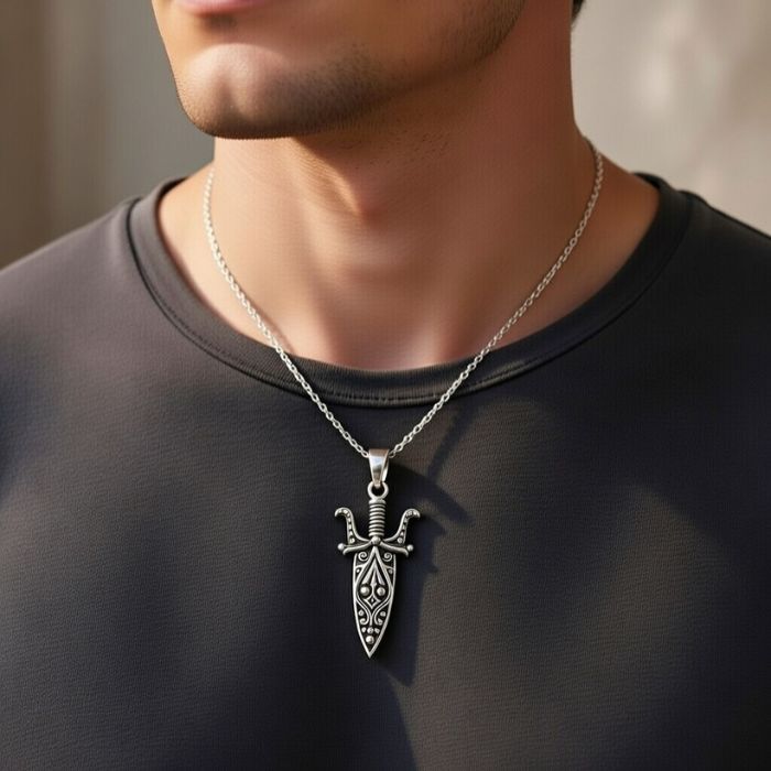 This sterling silver dagger pendant is a bold expression of strength, courage, and individuality. Crafted from 925 sterling silver, it features an intricately detailed dagger design with antique-style oxidized finishing that enhances every carved pattern. The sharp blade motif symbolizes protection, power, and fearless spirit, making it perfect for those who love statement jewellery. Durable yet lightweight, this pendant sits comfortably on the neck and pairs well with both casual and edgy outfits. Its unique design makes it ideal for men and women who prefer distinctive accessories. A great gift choice, this pendant adds character, confidence, and timeless appeal to any silver jewellery collection.