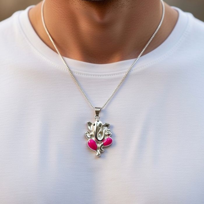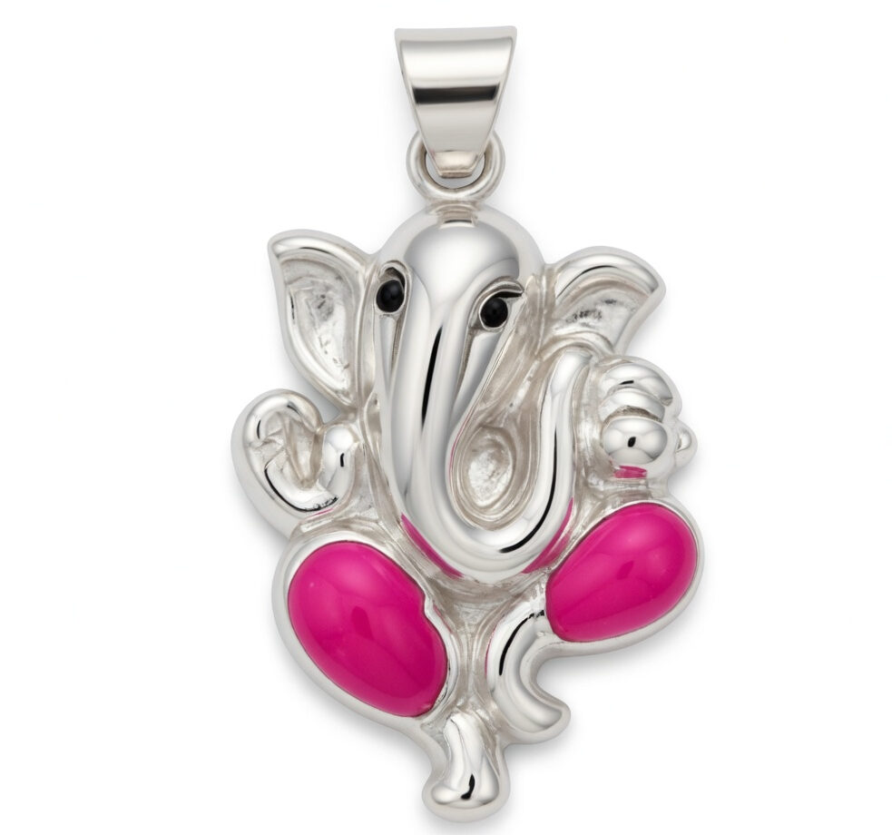 This sterling silver Ganesh pendant is a beautiful blend of devotion, elegance, and modern design. Crafted from 925 sterling silver, the pendant features a graceful Lord Ganesha motif symbolizing wisdom, prosperity, and new beginnings. The smooth silver finish is enhanced with vibrant pink enamel accents, adding a contemporary and eye-catching touch. Its polished surface reflects light beautifully, making it perfect for daily wear as well as festive occasions. Lightweight yet durable, this pendant pairs effortlessly with silver chains and complements both traditional and modern outfits. An ideal spiritual gift, this pendant brings positivity, blessings, and timeless charm to any jewellery collection.