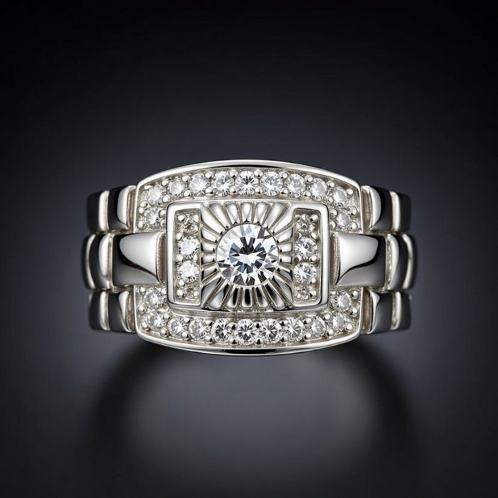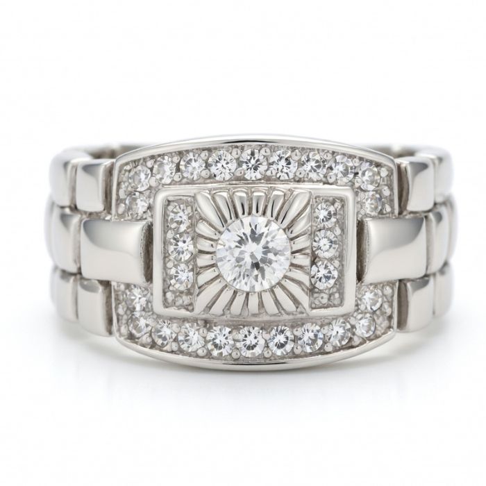 This elegant silver ring features a bold rectangular design highlighted by a brilliant central stone surrounded by finely set sparkling accents. Crafted from high-quality sterling silver, the ring showcases exceptional craftsmanship with a polished finish that enhances its luxurious appeal. The layered stone arrangement adds depth and brilliance, creating a striking statement look while maintaining refined elegance. Designed for comfort and durability, this ring is perfect for special occasions, evening wear, or as a standout everyday accessory. Its timeless yet modern design makes it ideal for those who appreciate sophisticated jewelry with a strong presence. A perfect choice for gifting or adding a distinctive piece to your silver jewelry collection.