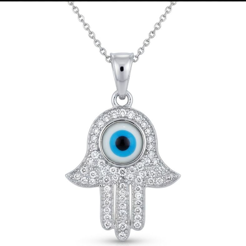 This elegant hand-shaped evil eye pendant chain is designed to protect against negative energy while adding a stylish touch to your look. Featuring a striking blue evil eye at the center with a sleek silver finish, it is perfect for everyday wear and meaningful gifting.