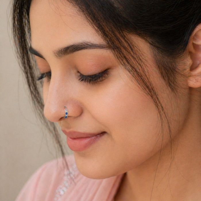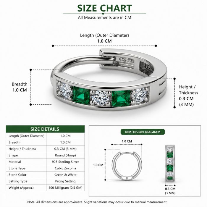 Elegant SRKJ 925 Sterling Silver hoop nose ring featuring premium green and white CZ stones. Lightweight, stylish, and perfect for daily wear, festive occasions, and gifting.