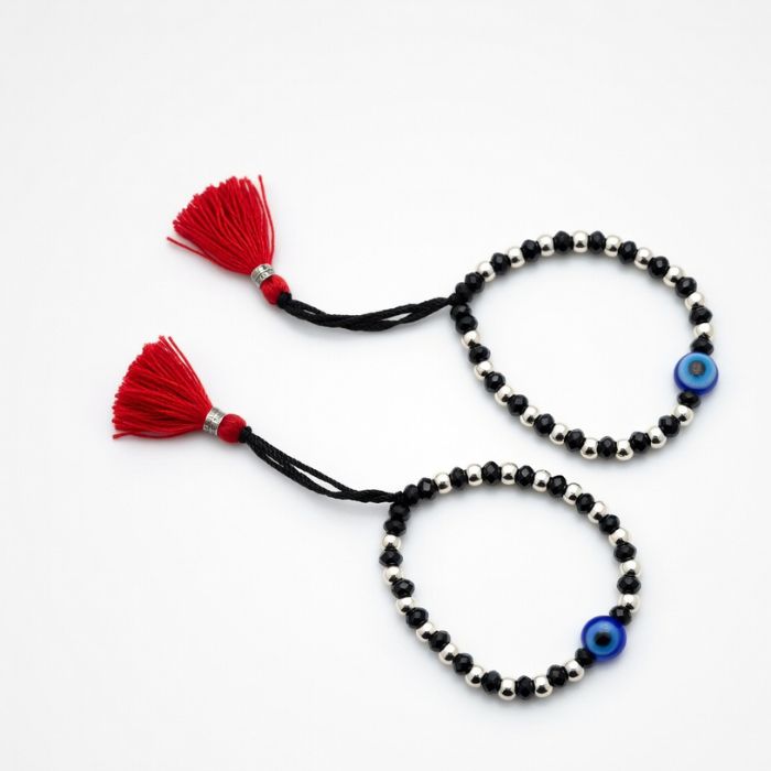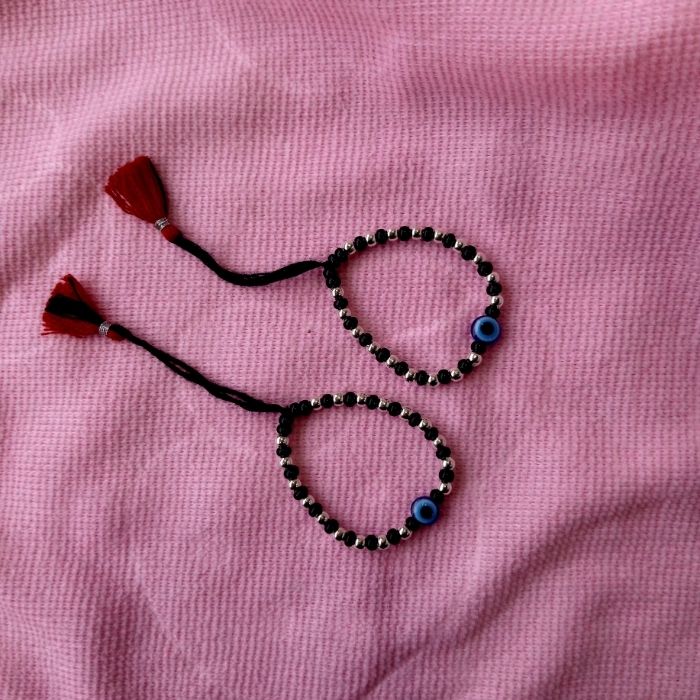 This adorable kids evil eye nazariya anklet is crafted to protect children from negative energy and evil eye effects. Designed with traditional black beads, silver accents, and a blue evil eye charm, it offers both cultural protection and a cute, stylish look. The soft adjustable thread ensures a comfortable and secure fit, making it ideal for babies and kids for everyday wear. 💙✨