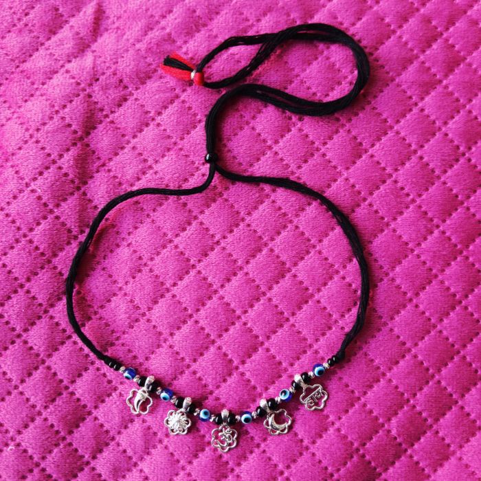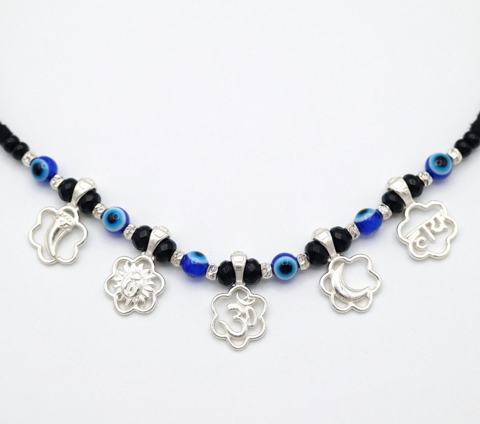This traditional kids Evil eye nazariya necklace is designed to be worn around a child’s neck for protection against negative energy and evil eye. Crafted with black beads and symbolic charms, it is believed to safeguard children from buri nazar while being lightweight and comfortable for daily wear.