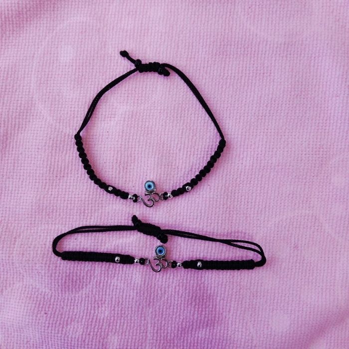 This kids evil eye and Om nazariya bracelet is thoughtfully designed to protect children from negative energy while inviting positivity and blessings. Featuring a blue evil eye charm and an Om symbol on a soft black adjustable thread, it is lightweight, skin-friendly, and comfortable for daily wear. A perfect blend of spiritual protection and simple style for babies and kids. ✨🙏