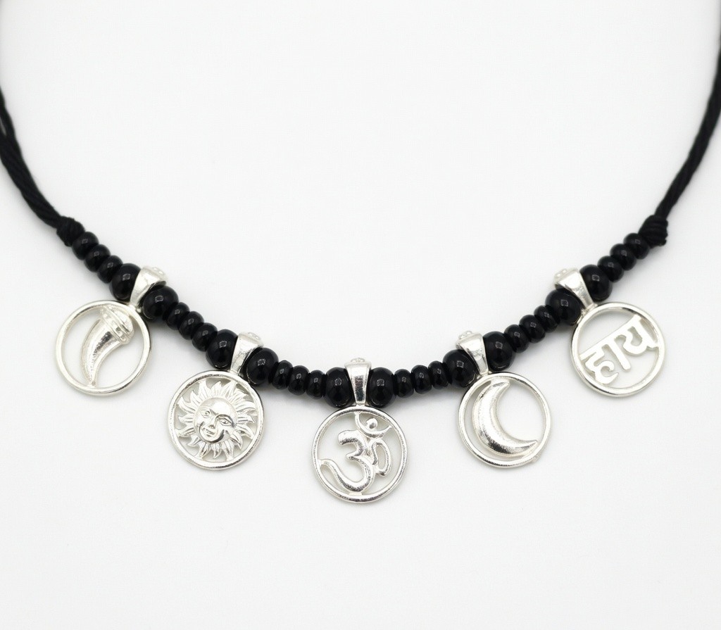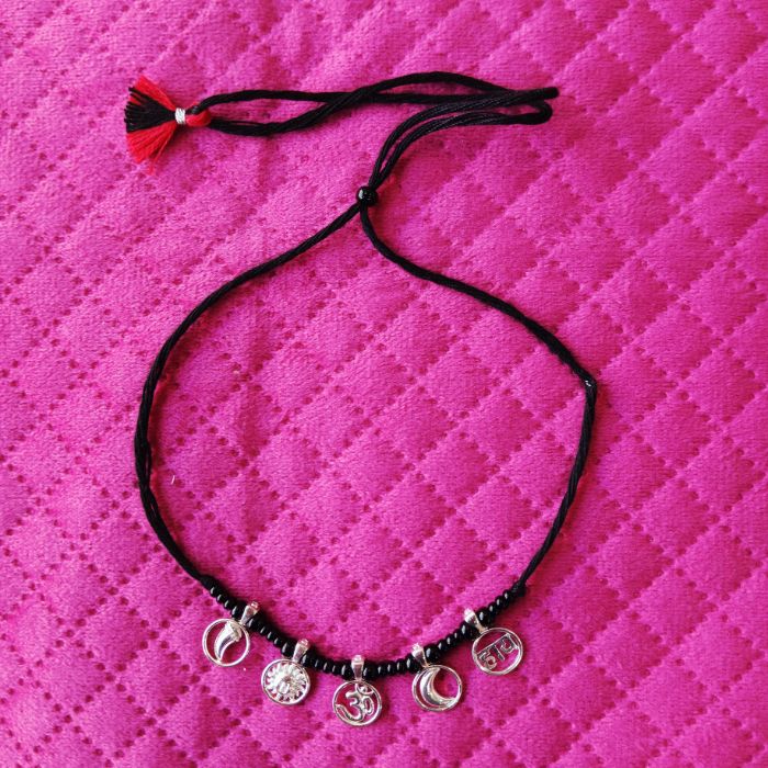 This traditional kids nazariya necklace is designed to be worn around a child’s neck for protection against negative energy and evil eye. Crafted with black beads and symbolic charms, it is believed to safeguard children from buri nazar while being lightweight and comfortable for daily wear.
