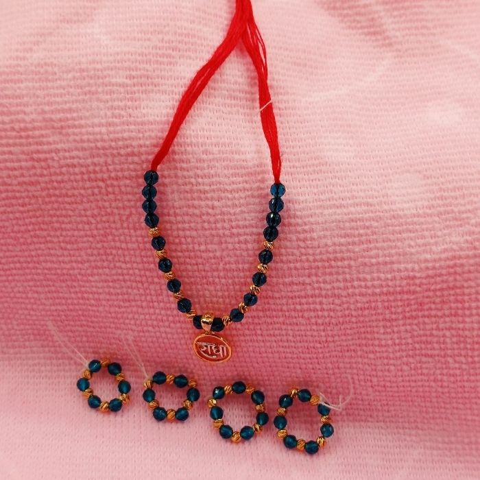 This graceful Laddu Gopal Necklace Set is crafted with deep blue beads, golden-toned bead accents, and a delicate silver charm, finished with a soft red adjustable thread.