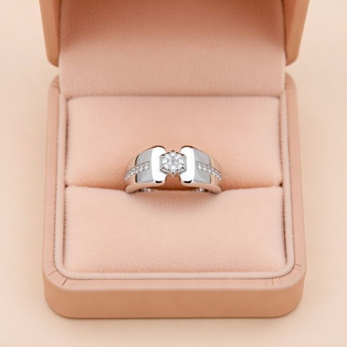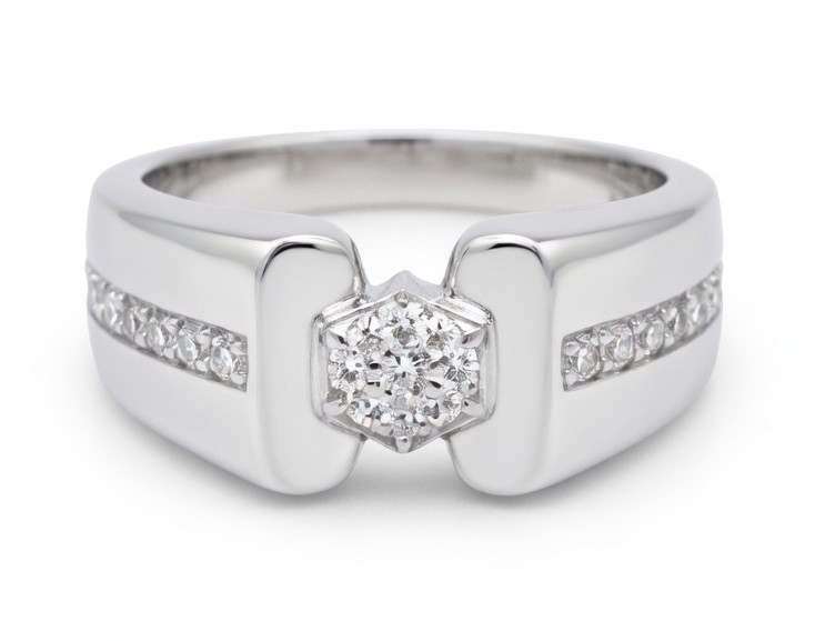 This modern silver ring is crafted with a distinctive hexagon-shaped centerpiece that beautifully highlights sparkling stones, giving it a refined and contemporary look. The smooth silver band is accented with subtle stone detailing on the sides, enhancing its overall elegance. Designed for comfort and durability, this ring is ideal for daily wear, office use, parties, or special occasions. A perfect choice for those who appreciate minimal yet sophisticated jewellery.