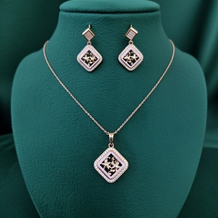 Enhance your elegance with this beautifully designed rose gold polish pendant chain and matching earrings set. Featuring a graceful square-shaped pendant with intricate detailing and a sparkling border, this set reflects a perfect blend of modern style and timeless charm.