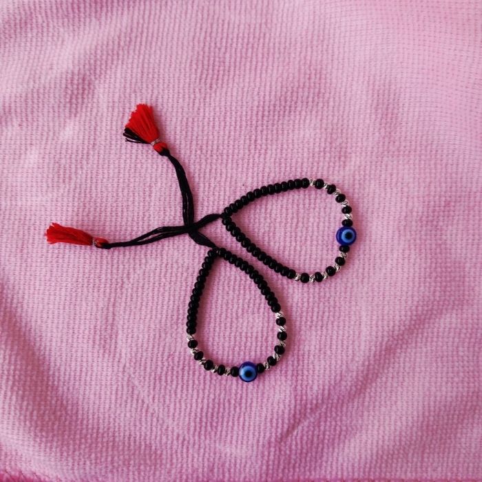 This elegant Child Evil Eye Nazariya Bracelet is crafted with black beads, polished silver bead accents, and a protective blue evil eye charm.