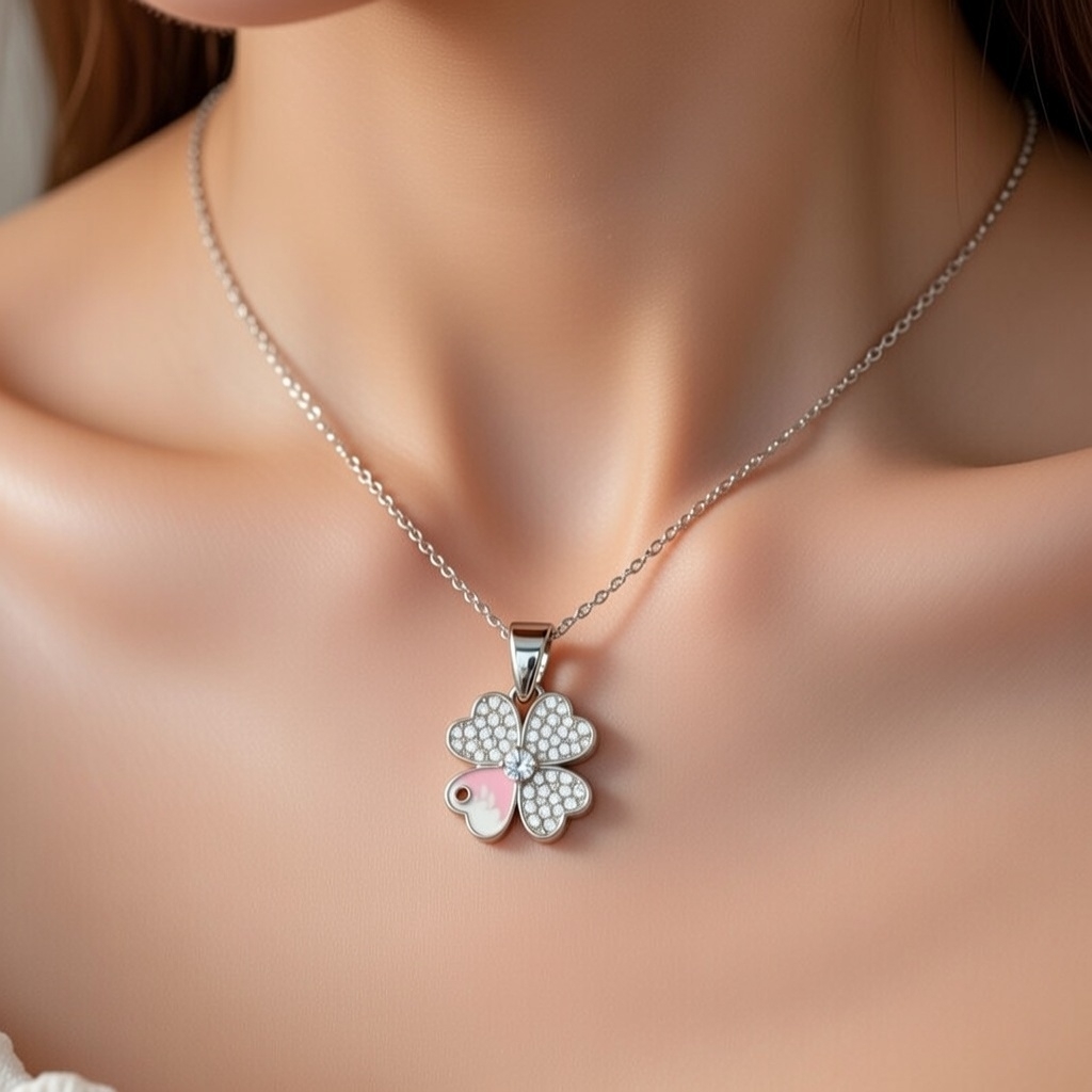 Add a touch of charm and elegance to your look with this beautifully crafted silver pendant necklace. Designed in a delicate clover shape, the pendant features shimmering stone detailing with a subtle pink accent, creating a graceful and feminine appeal. The polished silver finish enhances its shine and elegance.