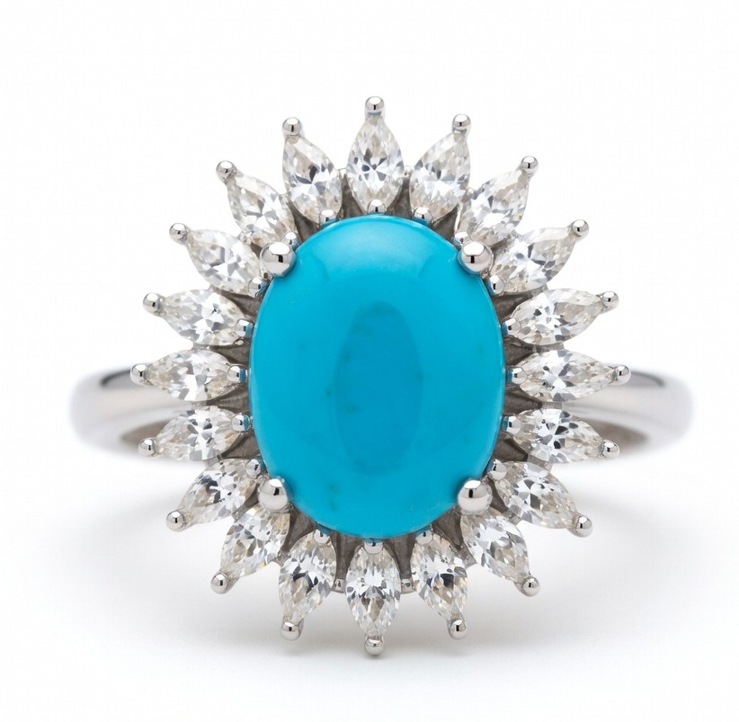 This stunning sterling silver ring features a mesmerizing oval-cut blue gemstone at its center, surrounded by a radiant halo of sparkling stones arranged in a sunburst pattern. The vivid blue centerpiece beautifully contrasts with the brilliant silver finish, creating a bold yet elegant statement. Expertly crafted with fine detailing and a polished band, this ring reflects luxury, confidence, and timeless charm. Perfect for special occasions, parties, or as a standout everyday accessory, this design symbolizes elegance, brilliance, and refined craftsmanship.