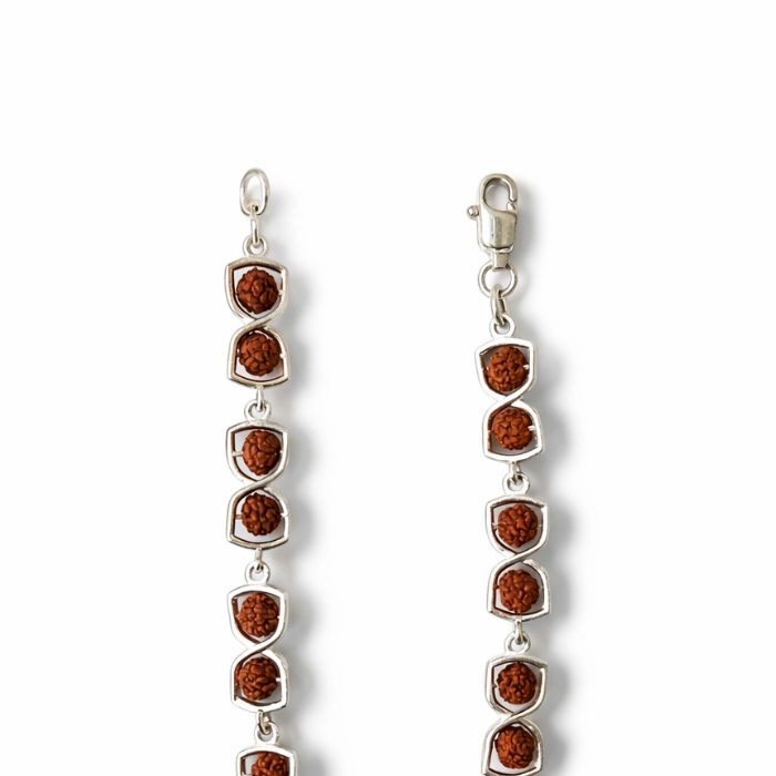 This beautiful silver chain features an elegant arrangement of natural Rudraksha beads, delicately set in polished silver frames for a refined and spiritual look. Crafted from high-quality silver, the chain offers durability, a smooth finish, and long-lasting shine. The evenly spaced Rudraksha beads symbolize positivity, peace, and divine energy, while the subtle silver accents add a modern touch. Lightweight and comfortable to wear, this chain is perfect for daily use, meditation, or spiritual occasions. A timeless piece that blends tradition with contemporary design, making it an ideal gift or a meaningful addition to your jewelry collection.