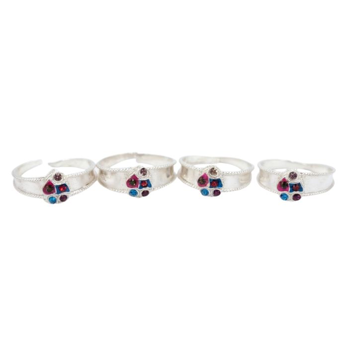 Add a vibrant touch to your traditional look with these exquisitely crafted silver toe rings, featuring a unique multicolor stone design set on a broad silver band. Made from high-quality silver, these toe rings offer a smooth finish, comfortable adjustable fit, and long-lasting shine.