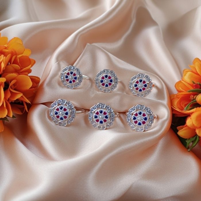 These exquisite silver toe rings (bichiya) are crafted from premium silver, showcasing intricate floral-inspired detailing with vibrant red and blue stone accents. Designed to reflect traditional elegance with a modern touch, each toe ring features fine craftsmanship that enhances its rich, ornamental appeal. The polished silver finish adds a graceful shine, while the adjustable design ensures a comfortable and secure fit for everyday wear. Perfect for weddings, festive occasions, or cultural celebrations, these bichiya beautifully complement ethnic attire as well as contemporary looks. A timeless symbol of femininity and tradition, these silver toe rings are an elegant addition to any jewellery collection.
