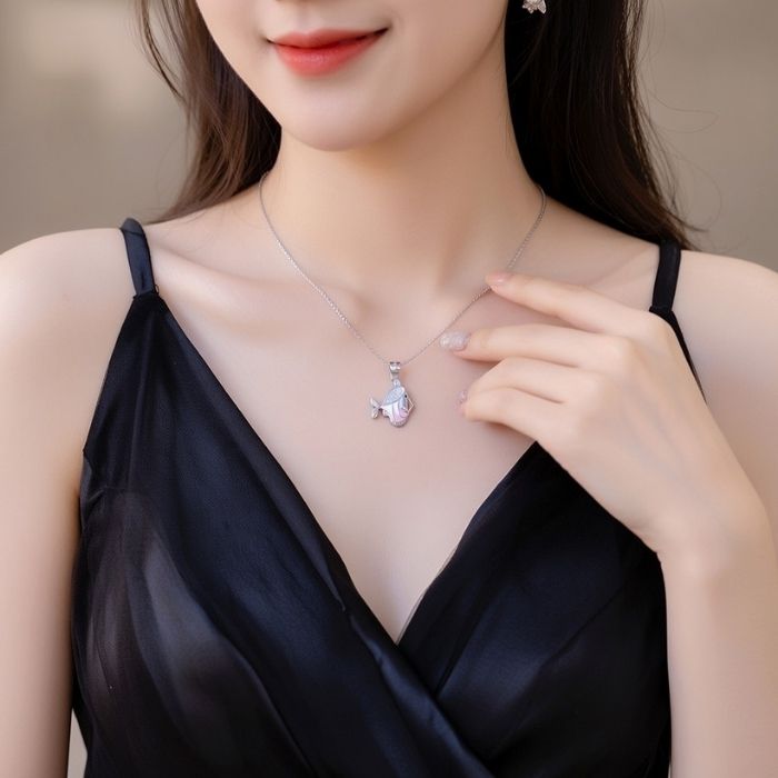 This elegant sterling silver fish pendant features soft enamel detailing and a graceful silhouette that symbolizes positivity, prosperity, and harmony. Lightweight and beautifully crafted, it is ideal for everyday wear and meaningful gifting.